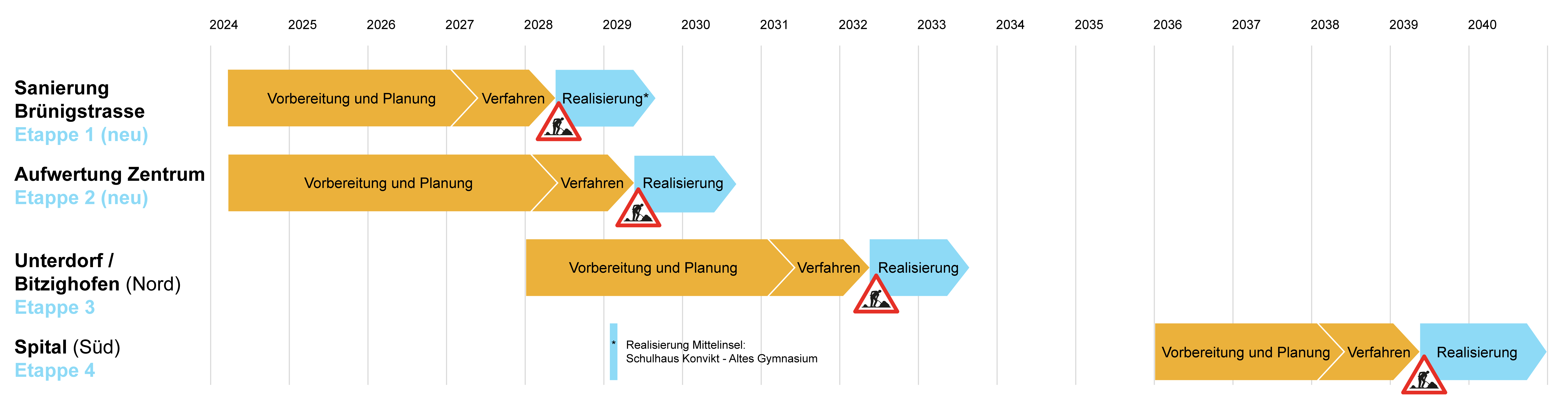 Die Sanierung und Aufwertung der Ortsdurchfahrt erfolgt in vier Etappen. Der Zeitplan sieht folgendermassen aus: